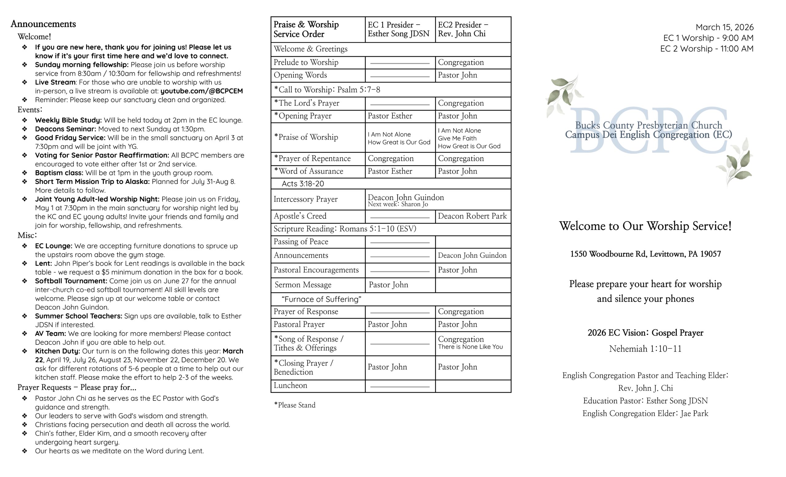 Bulletins About UsBulletinsChildrenCollegeCommitmentCommunityContact UsDaily Bible Reading and ReflectionElementaryHomeKindergartenMaterialsMealsMentorshipMessageNPRegistration FormResourcesRuthServiceTransformationVideosWorshipYYouth